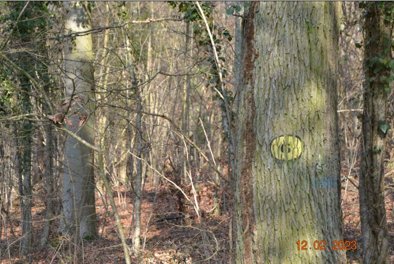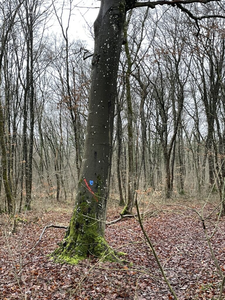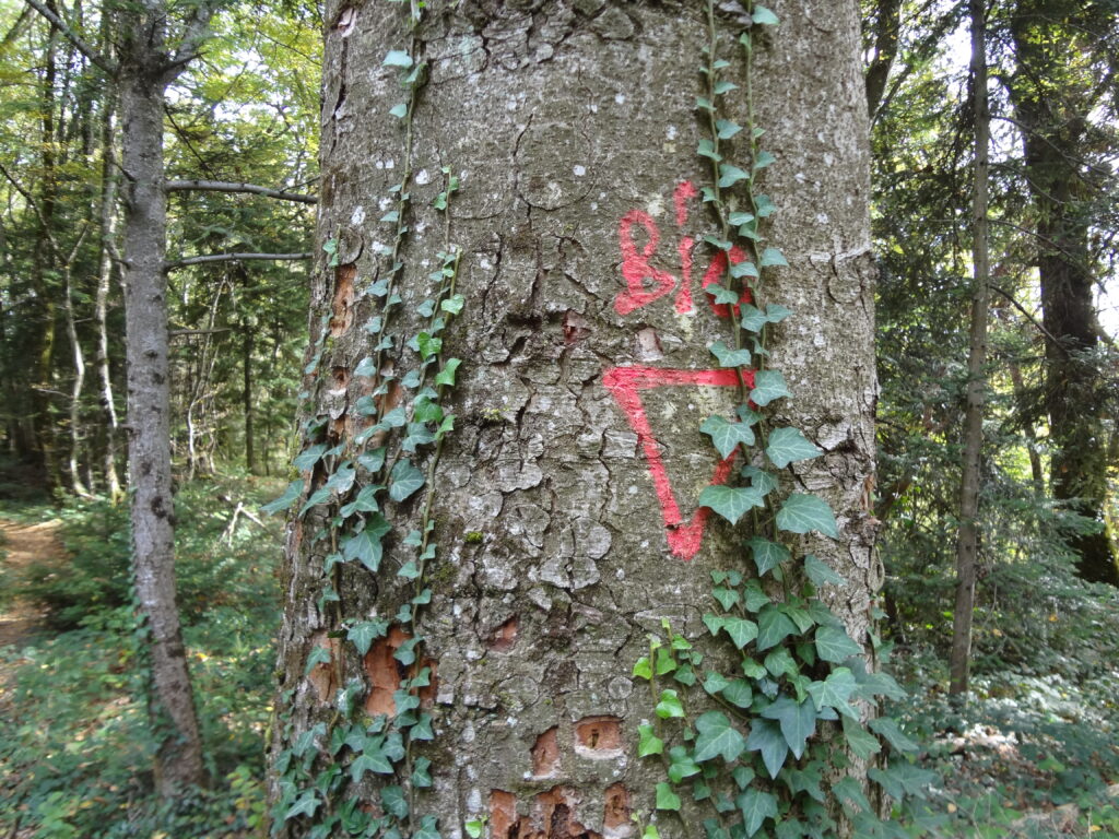 Si l’on s’aventure un peu plus profondément dans la forêt on peut rencontrer un arbre mort ou un arbre avec des fonctions écologiques reconnues. Il arbore un triangle inversé à la peinture chamois et « bio » est écrit au dessus ; c’est un arbre à haute valeur écologique (des arbres qui nous intéressent tout particulièrement).