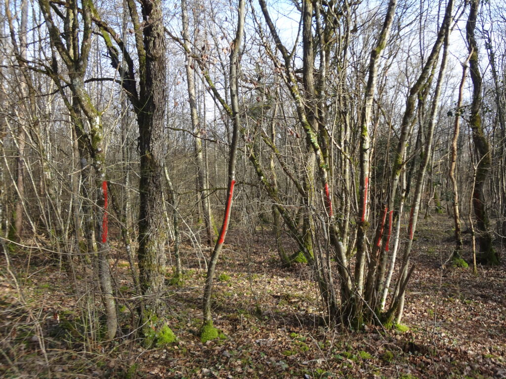 Ici, le forestier n’a pas décidé de repeindre la forêt en rouge, il va faire un cloisonnement, autrement dit une allée de 4 m de large sur la longueur de la parcelle pour laisser passer les engins forestiers.