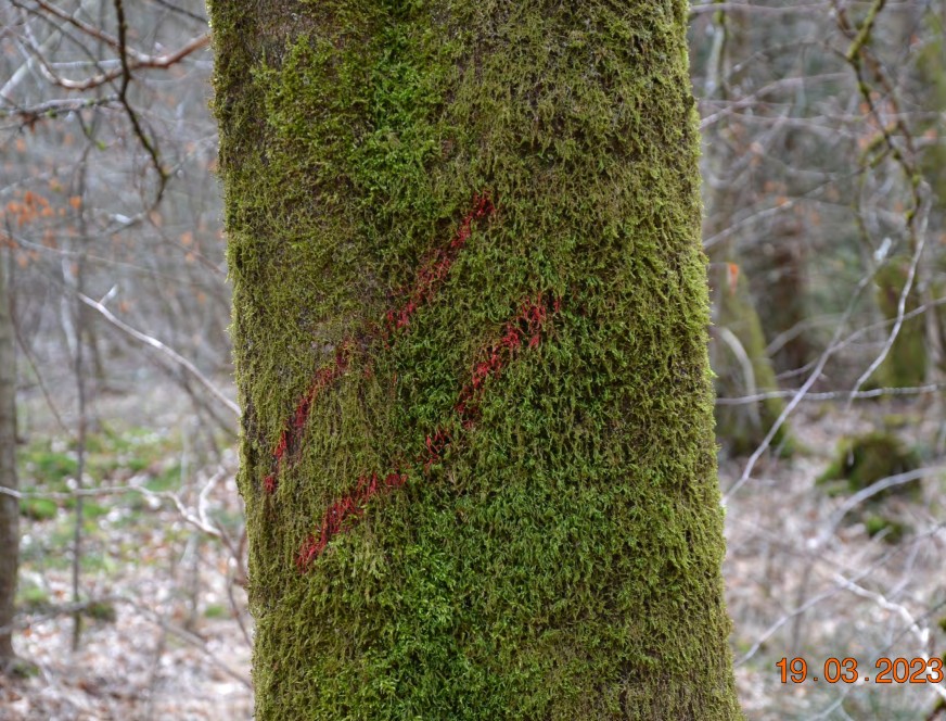 Lorsque l’on se promène dans nos forêts de Lorraine, on peut rencontrer diverses marques à la peinture faites par le forestier, le chasseur, le gestionnaire forestier, l’expert forestier ou d’autre personnes (des sportifs en général). Parfois de petites pancartes sont aussi présentes.